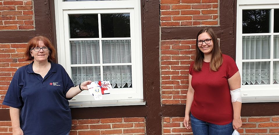Im Rahmen des Blutspendetermins am 17.08.2020 in Langen bedankte sich Annette Uphaus (DRK OV Langen) bei Anne Hermeling für ihre 25. Blutspende mit einem Präsent.
